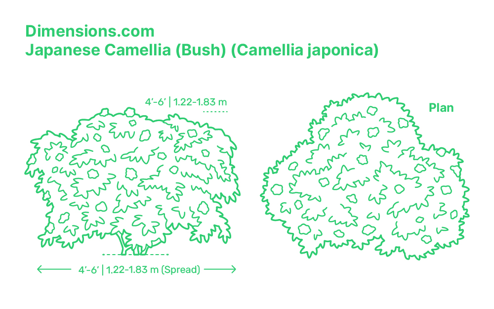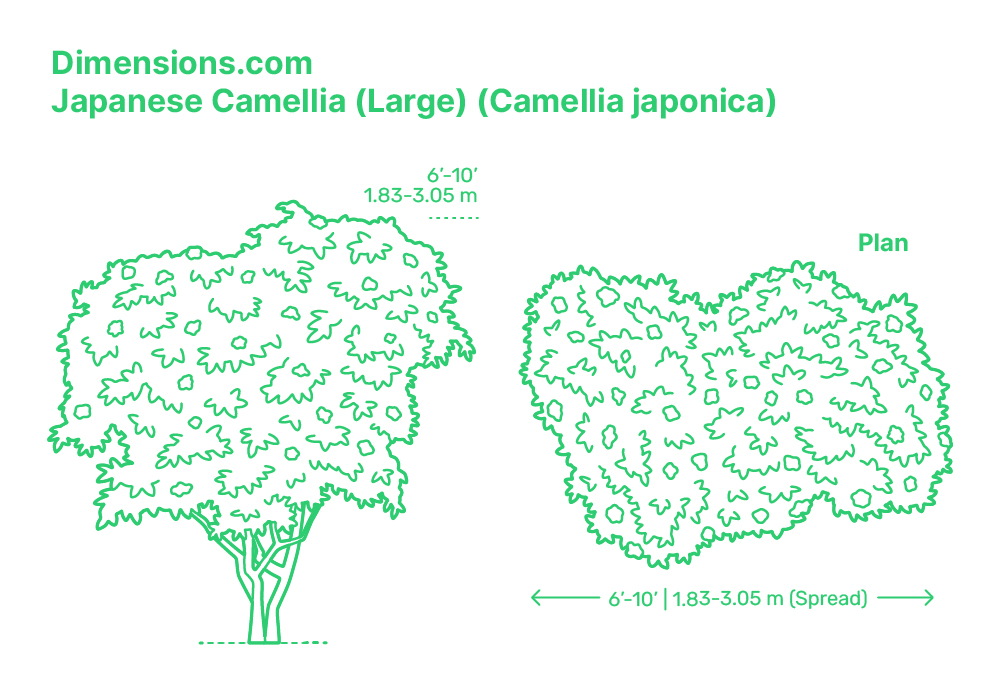 Japanese Camellia (Large) has a typical overall height between 6’-10’ (1.83-3.05 m) and spread diameter of 6’-10’ (1.83-3.05 m).